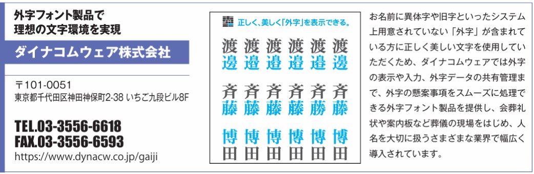 | ダイナコムウェア㈱ | 文字フォント開発、外字フォント制作 | 〒101-0051 東京都千代田区神田神保町2-38 いちご九段ビル8階 | 03-3556-6638