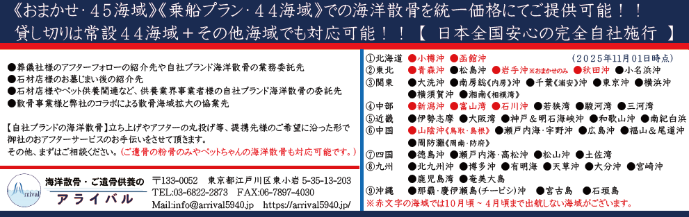 | ㈱アライバル | 海洋散骨 | 〒133-0052 東京都江戸川区東小岩5-35-13-203 | 03-6822-2873