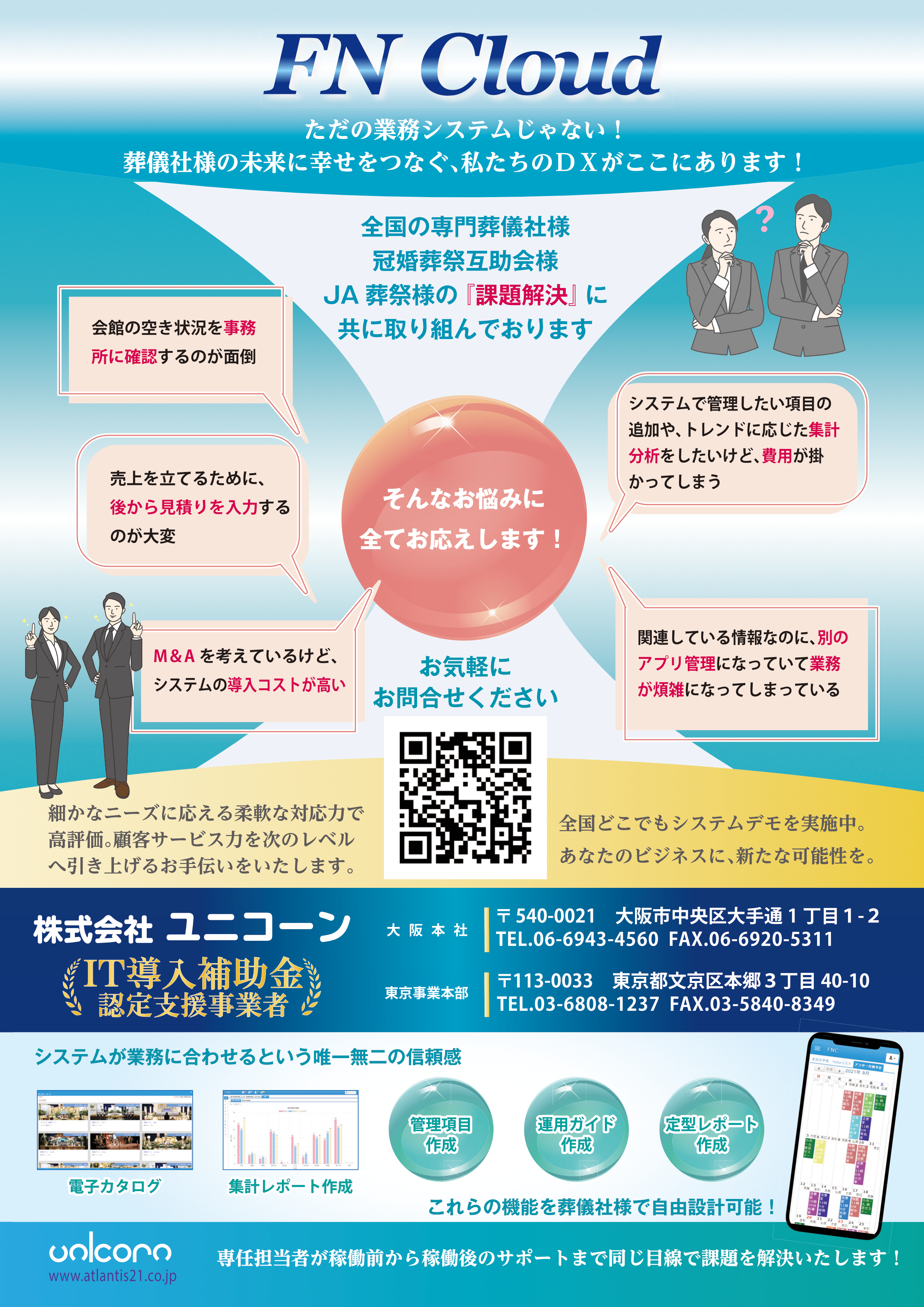 | ㈱ユニコーン | 葬祭業務システム「FN Cloud」 | 〒540-0021 大阪市中央区大手通1-1-2 | 06-6943-4560