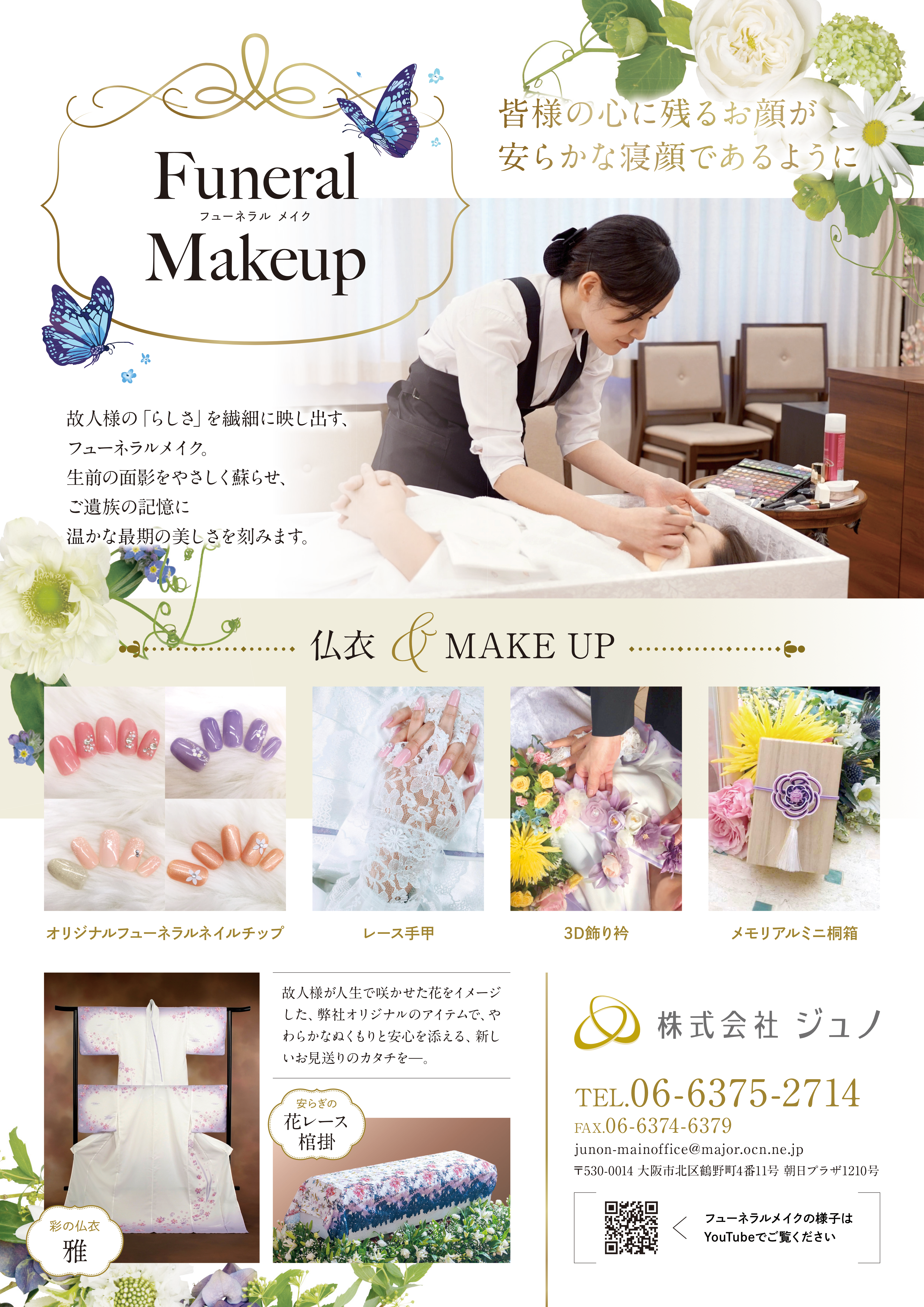 | ㈱ジュノ | フューネラルメイク | 〒530-0014 大阪市北区鶴野町4-11 朝日プラザ1210号 | 06-6375-2714